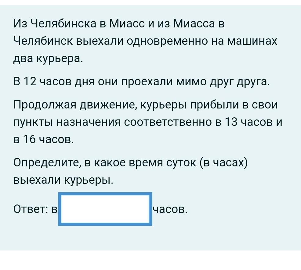 Верный ответ: "в 10 часов", т.е. курьеры выехали за 2 часа до момента пересечения
