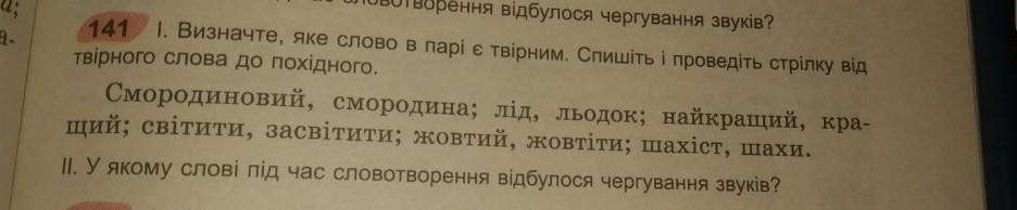 141 1. Визначте, яке слово в парі є твірним. Спишіть і проведіть стрілку від твірного слова до похідного. Смородиновий, смородина; лід, льодок; найкращий, кра- щий; світити, засвітити; жовтий, жовтіти; шахіст, шахи. ІІ. У якому слові під час словотворення відбулося чергування звуків? помогите пж