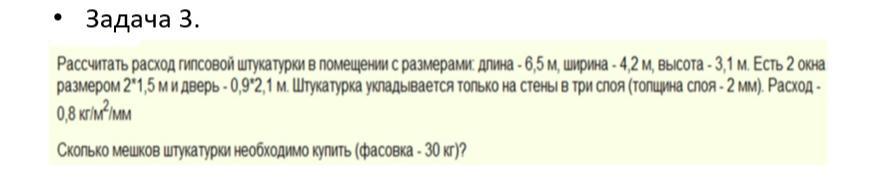 Рассчитать расход гипсовой штукатурки в помещении с размерами: длина 6,5м, ширина 4,2м, высота 3,1м. Есть 2 окна размером 2*1,5м и дверь 0,9*2,1м. Штукатурка укладывается только на стены в три слоя (толщина слоя 2мм). Расход 0,8кг/м^2/мм.