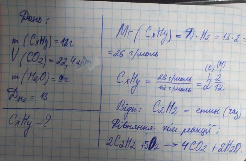 При спалюванні 13 г деякого газу отримали 22,4 л СО2 і 9 г Н2О. Визначте формулу невідомого газу, якщо його густина за воднем 13;