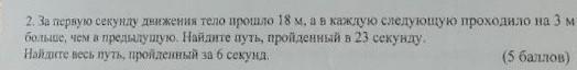 2. За первую секунду движения тело прошло 18 м, а в каждую следующую проходило на 3 м больше, чем в предыдушую. Найдите путь, пройденный в 23 секунду. Найдите весь путь, пройденный за 6 секунд.