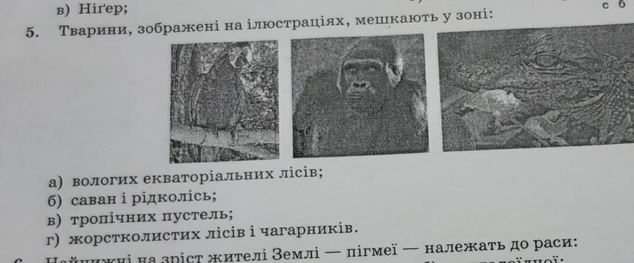 Срочно помощь нужна за всяку фигню БАН! 5. Тварини, зображені на ілюстраціях, мешкають у зоні: 5 сб 1 л а) вологих екваторіальних лісів; б) саван і рідколісь; в) тропічних пустель; г) жорстколистих лісів і чагарників.