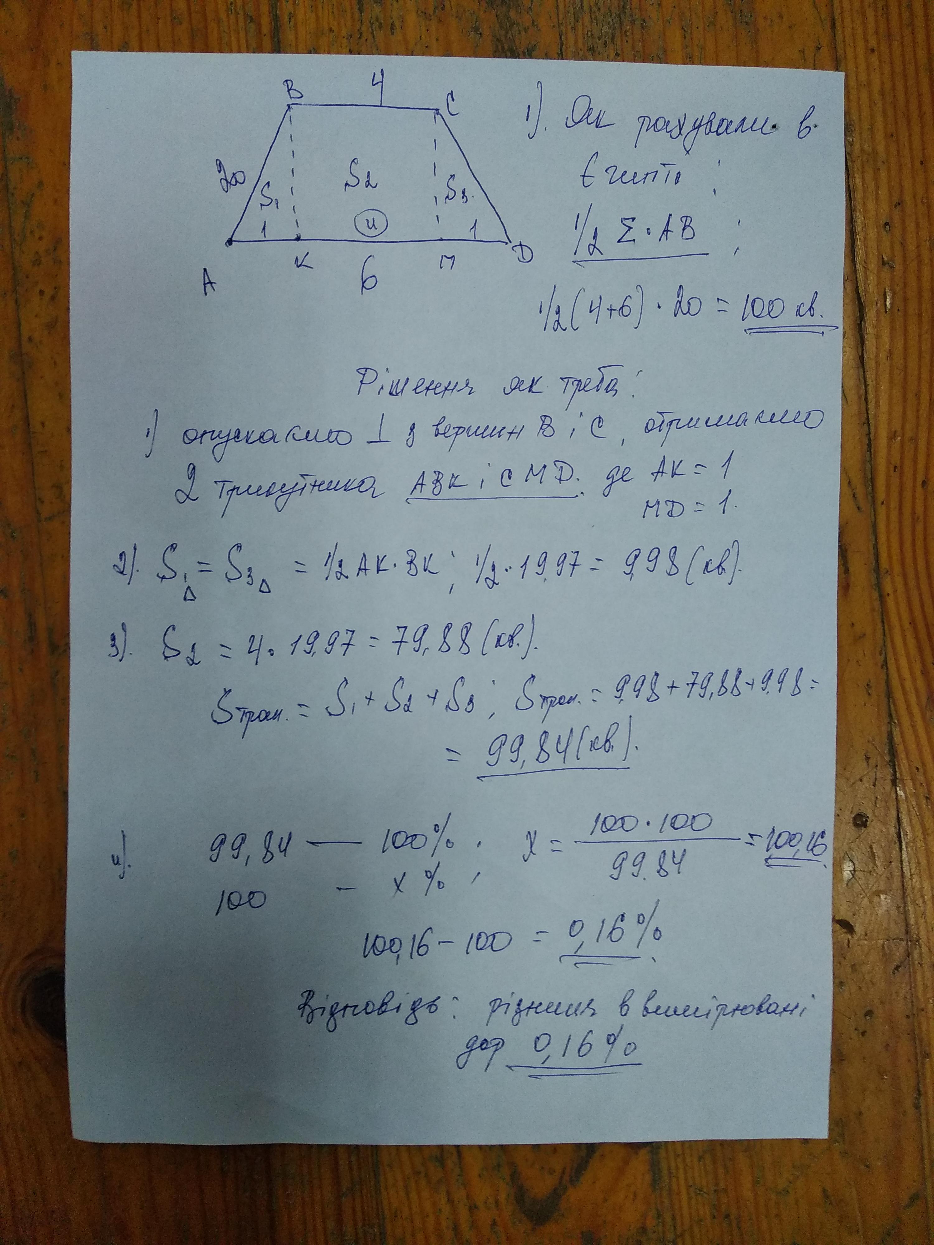 смотри, находишь площадь как египтяне, потом как нормальный человек ( 100 и 99.85)