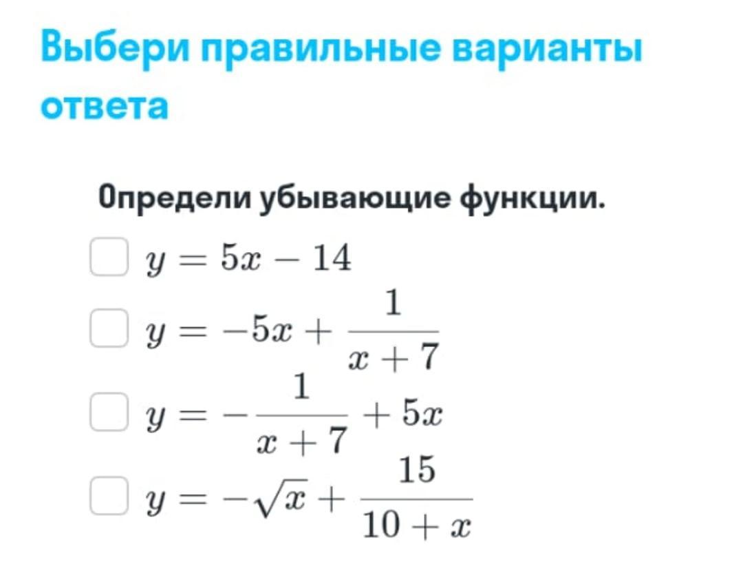 Убывающие функции: у=-5х+1/(х+7) и у= -√х+15/(10+х) .