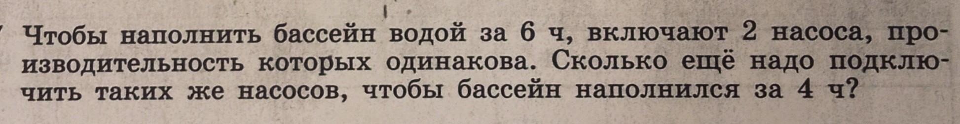 Если 2 насоса справляются за 6 часов работы наполнения басейна, то 1 насос сможет только за 8 часов. А вот 3 насоса уже смогут за 4 часа.