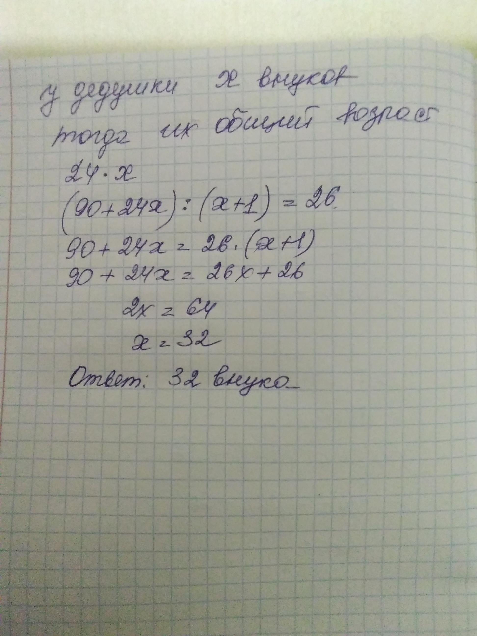 Дедушке 90 лет. Средний возраст его внуков 24лет. Если сложить возраст всех внуков с возрастом дедушки и найти их среднее арифметическое, то получится 26 сколько внуков у дедушки