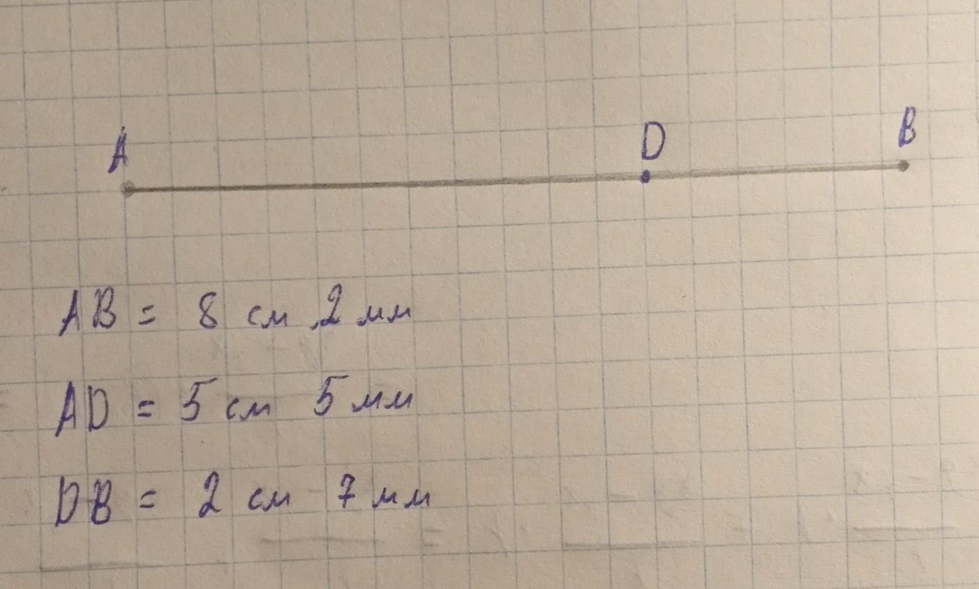 2.Накресліть відрізок АВ довжиною 8 см 2 мм. Позначте на ньому точку D. Запишіть усі відрізки, що утворилися на рисунку та виміряйте їх довжини