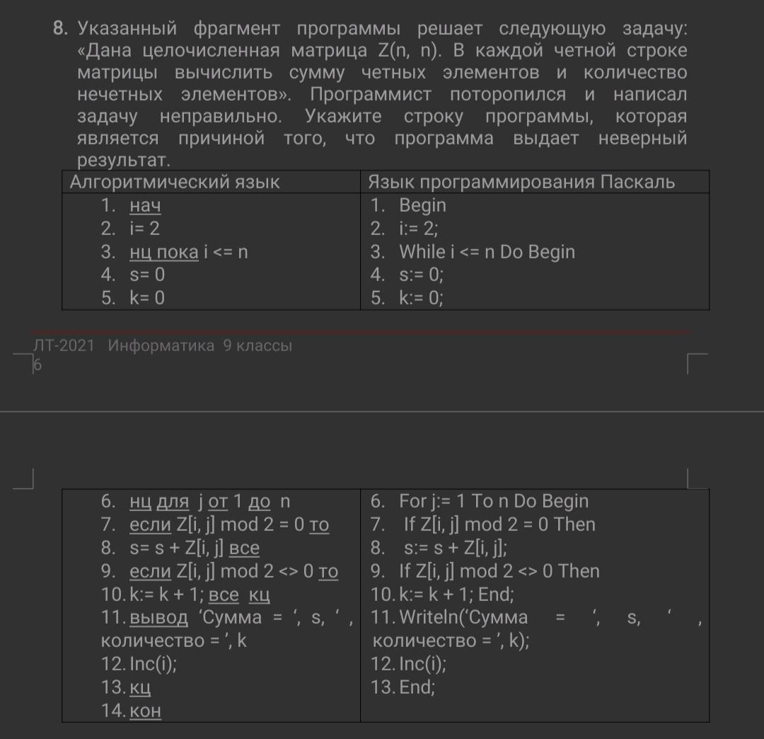 90 БАЛЛОВ.Указанный фрагмент программы решает следующую задачу: «Дана целочисленная матрица Z(n, n). В каждой четной строке матрицы вычислить сумму четных элементов и количество нечетных элементов». Программист поторопился и написал задачу неправильно. Укажите строку программы, которая является причиной того, что программа выдает неверный результат.