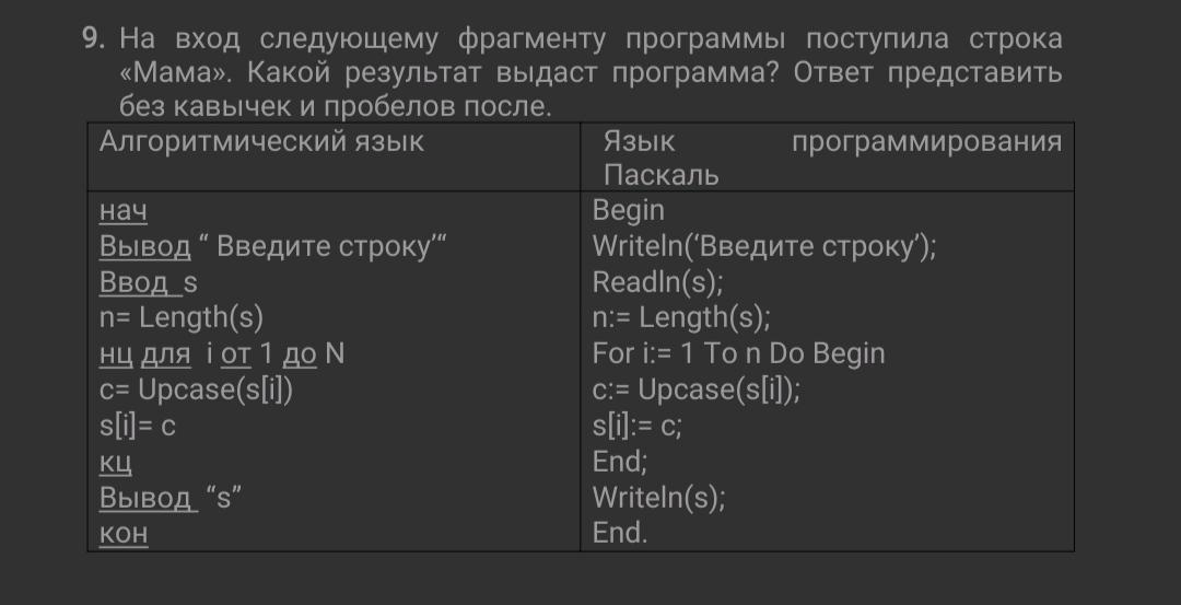 80 БАЛЛОВ. На вход следующему фрагменту программы поступила строка «Мама». Какой результат выдаст программа? Ответ представить без кавычек и пробелов после.