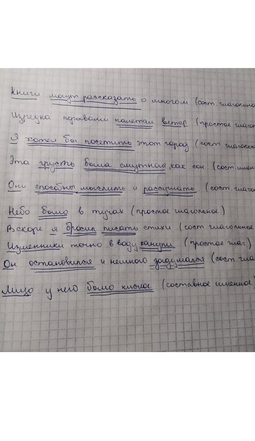 Выделите в предложениях грамматическую основу. Укажите тип сказуемого. 1. Книги могут рассказать о многом. 2. Изредка порывами налетал ветер. 3. Я хотел бы посетить этот город 4. Эта грусть была смутная, как сон. 5. Они способны Мыслить и рассуждать. 6. Небо было в тучах. 7. Вскоре я бросил писать стихи. 8. Изменники точно в воду канули. 9. Он остановился и немного задумался. 10. Лицо у него было кислое.