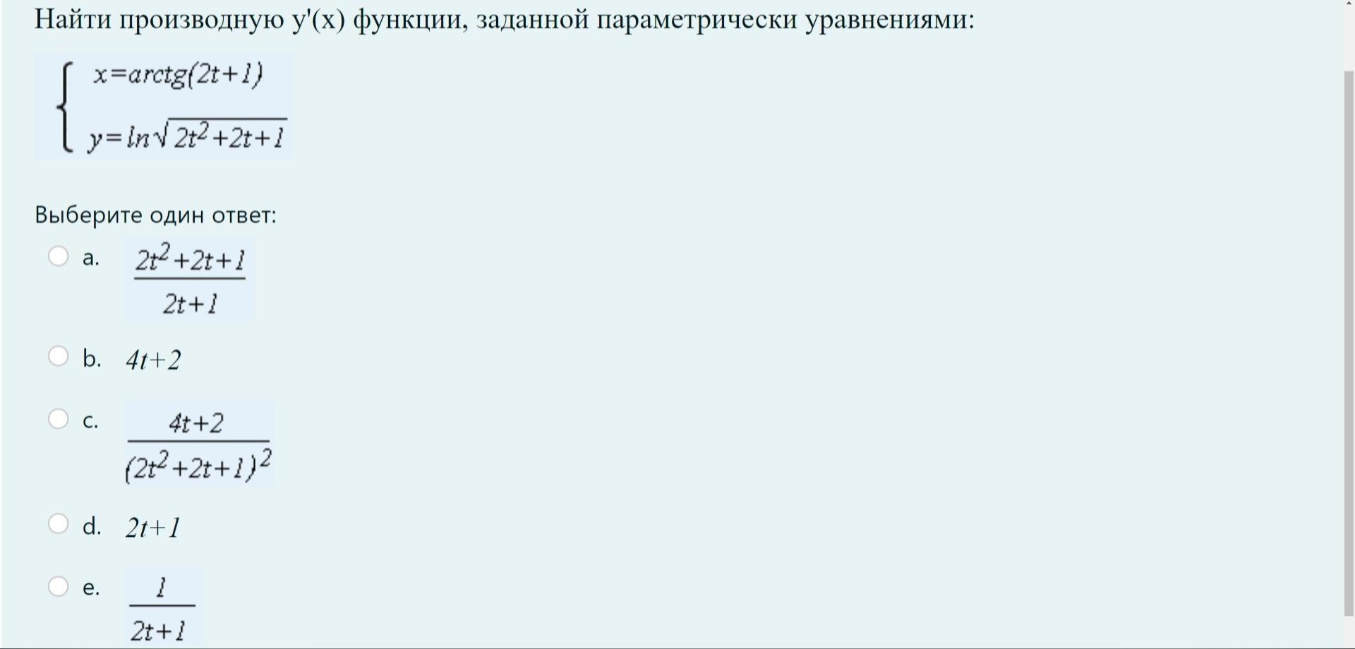 x=arctg(2·t+1), y=ln√(2t²+2t+1)