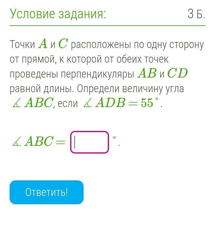 Точки A и C расположены по одну сторону от прямой, к которой от обеих точек проведены перпендикуляры AB и CD равной длины. Определи величину угла∡ABC, если ∡ADB = 55°.