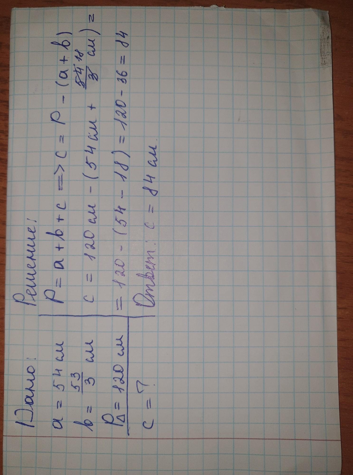 нам даны периметр (Р = 120 см) и две стороны треугольника: а = 54 см,в = 54/3 см. чтобы найти периметр треугольника мы используем формулу: Р = а + в + с. из этого выводим формулу для нахождения стороны с. с = Р - (а + в). подставляем числа вместо буквенных обозначением и получаем ответ с = 84 см