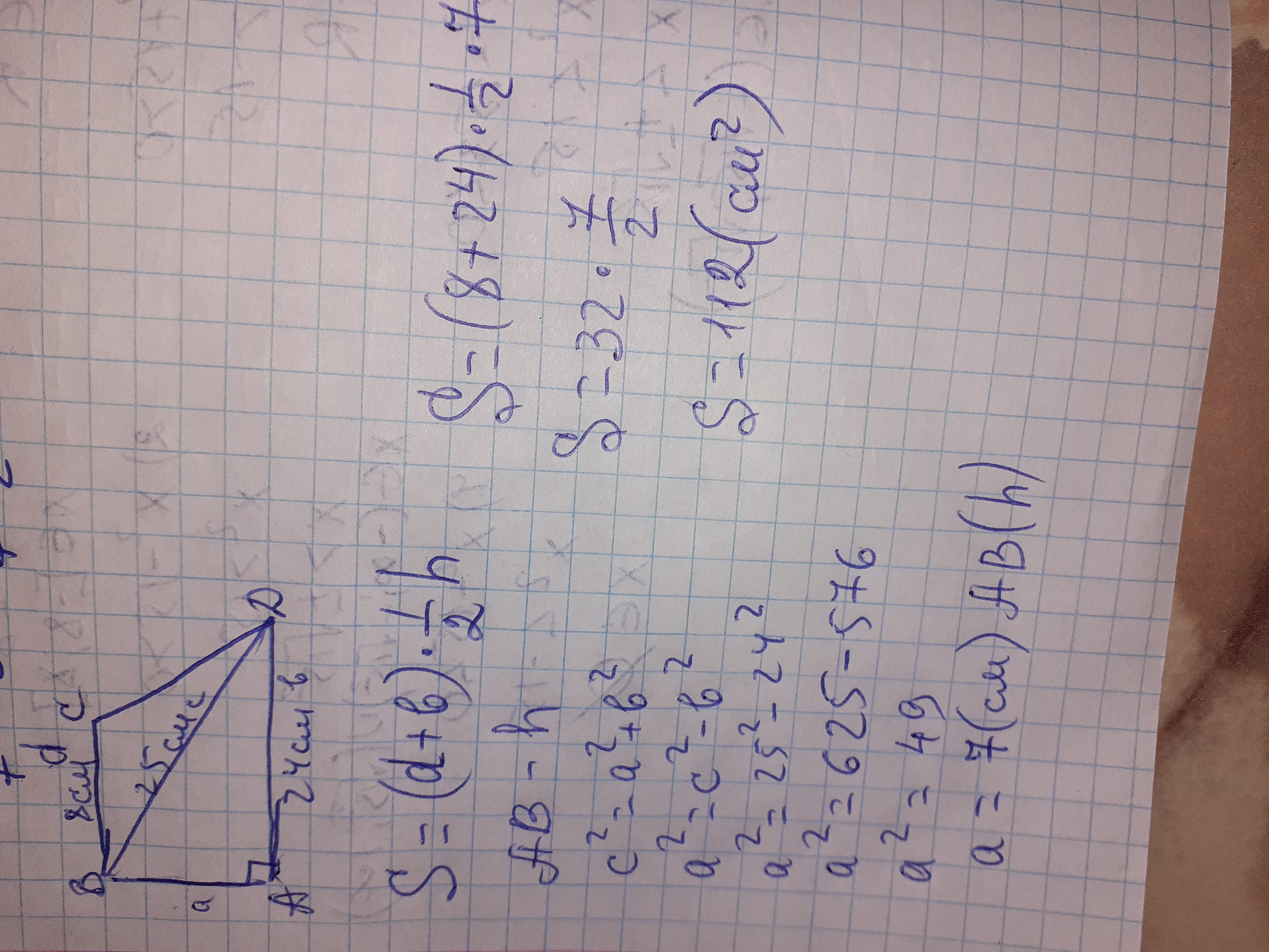 Большая диагональ прямоугольной трапеции равна 25 см, а большее основание - 24 см. Найдите площадь трапеции, если ее