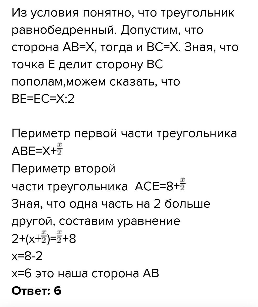 . в треугольнике ABC AB = BC, AC = 8 см, Еє вс, причем BE = = ЕС. Точка Е делит периметр треугольника АВС на две части, из которых одна больше другой на 2 см. Найдите AB.