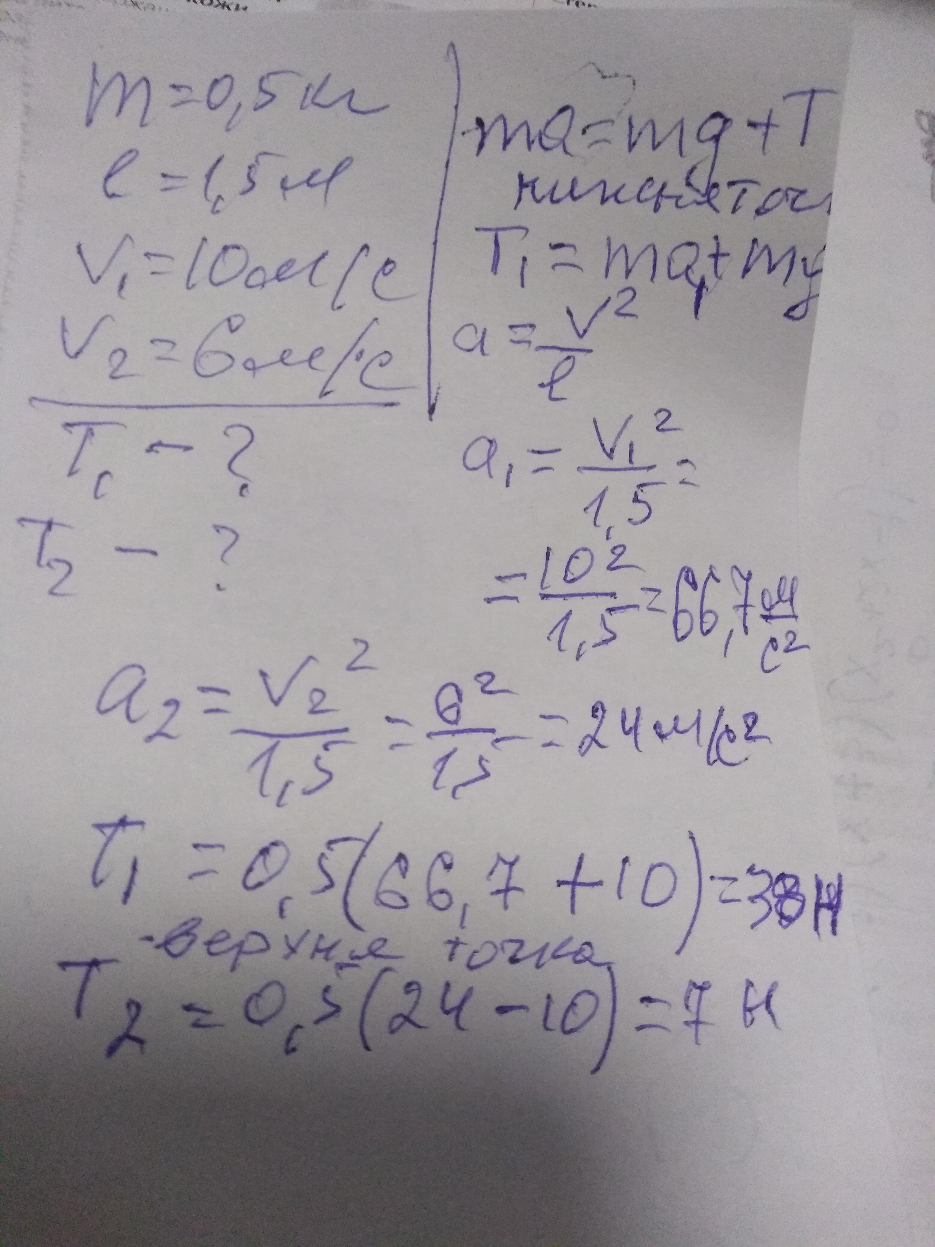 кулька масою 500г обертають у вертикальній площині на шнурі довжиною 1,5 м. Нижню точку траєкторії кулька проходить із швидкістю 10м/с , а верхню із швидкістю 6 м/с. Знайдіть силу натягу шнура, коли кулька знаходиться в цих точках.