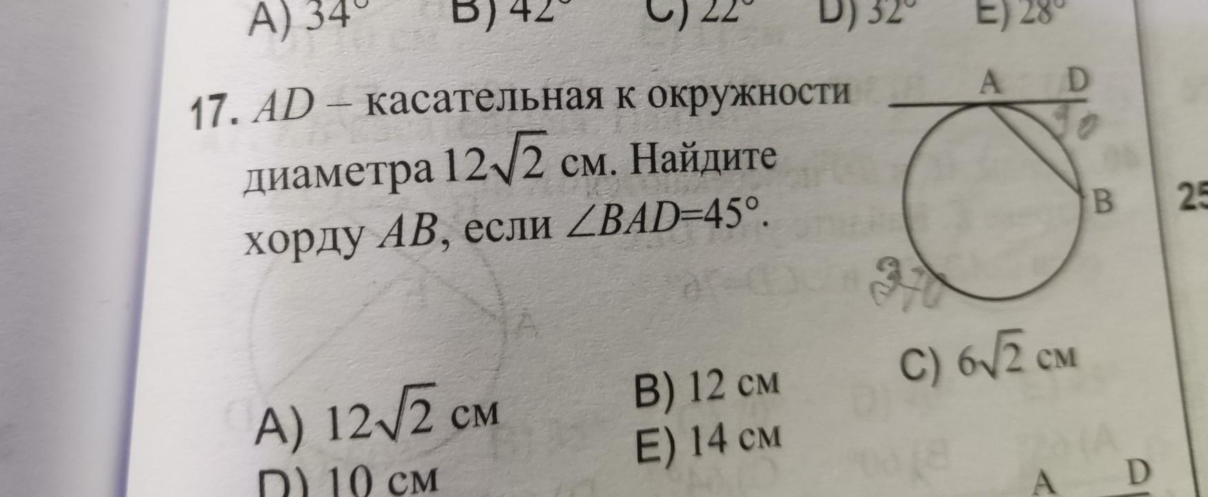 Объяснение: Смотрите рисунок. Из точек А и В проведены прямые параллельно и перпендикулярно касательной. Эти прямые пересекаются в точке О. Точка О является центром окружности, так как <ВАД = 45 градусов, а дуга АВ в этом случае = 90 градусов. Таким образом, имеем прямоугольный треугольник АВО с равными катетами длиной (12√2)/2 = 6√2 см. Тогда по теореме Пифагора АВ = √2(6√2)²= √2*36*2 = 12см