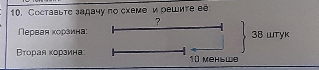 В первой корзине на 10 больше яблок, чем во второй. Всего 38 яблок. Надо найти, сколько яблок в первой и во второй корзине.