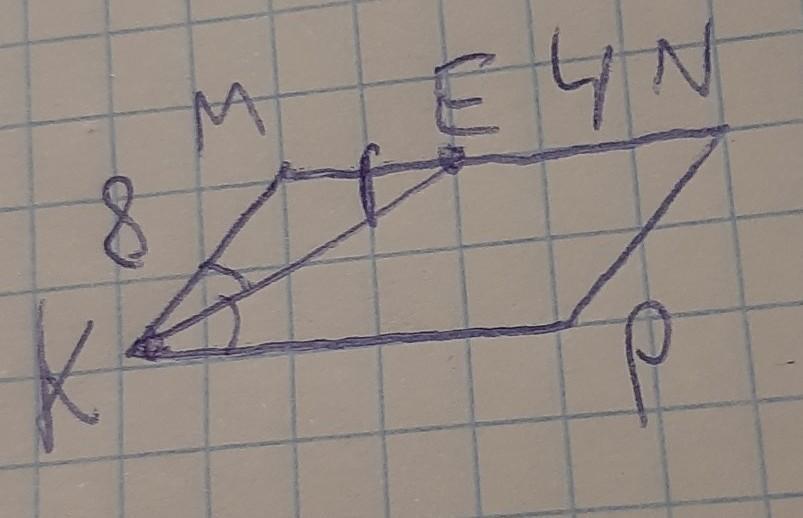 MN и KP из чего следует что угол МЕK = углу EKP как накрест лежащие углы. Из чего следует треугольник KME равнобедренный, а по условию нам дана сторона KM =8 значит МЕ тоже равна 8