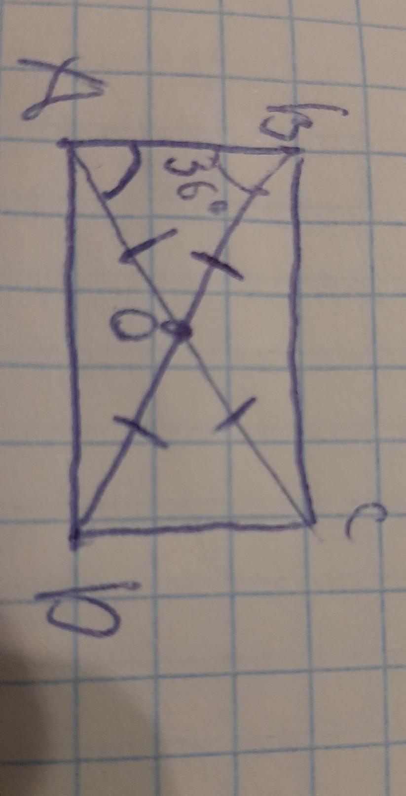 треугольник АBO равнобедренный из чего следует что угол ABO = углу BAO = 36 из этого мы можем найти угол АОB = 180 - угол BAO - угол АBO = 180-72 =108