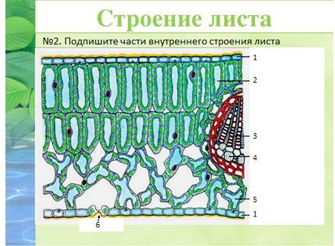 1-кожица, 2-столбчатая ткань,6-устьице, 5-губчатая ткань