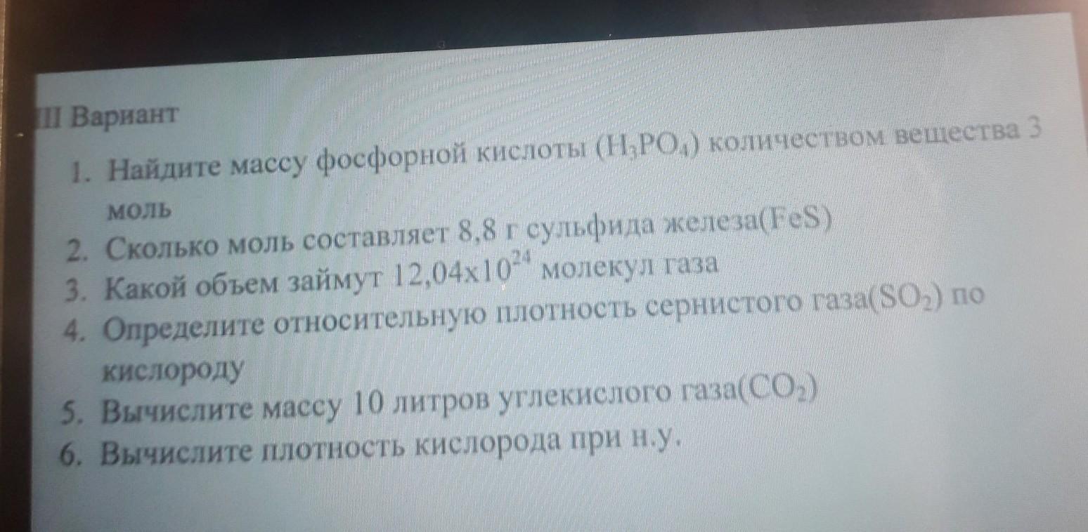 ІІ Вариант 1. Найдите массу фосфорной кислоты (НРО,) количеством вещества 3 МОЛЬ 2. Сколько моль составляет 8,8 г сульфида железа(FeS) 3. Какой объем займут 12,04x10° молекул газа 4. Определите относительную плотность сернистого газа (SOF) по кислороду 5. Вычислите массу 10 литров углекислого газа(СО) 6. Вычислите плотность кислорода при н.у. помоги пожалуйста