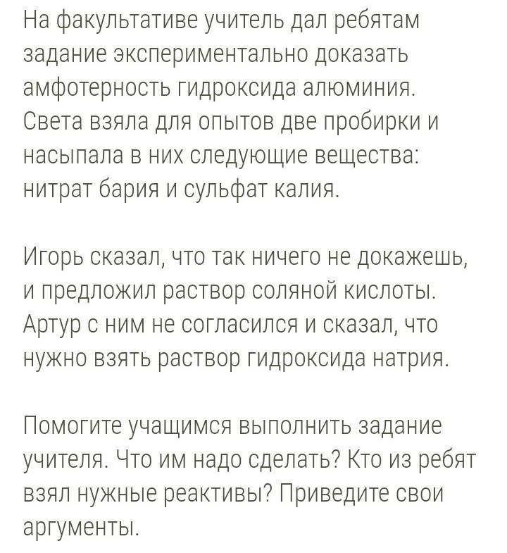 На факультативе учитель дал ребятам задание экспериментально доказать амфотерность гидроксида алюминия. Света взяла для опытов две пробирки и насыпала в них следующие вещества: нитрат бария и сульфат калия. Игорь сказал, что так ничего не докажешь, и предложил раствор соляной кислоты. Артур с ним не согласился и сказал, что нужно взять раствор гидроксида натрия. Помогите учащимся выполнить задание учителя. Что им надо сделать? Кто из ребят взял нужные реактивы? Приведите свои аргументы.