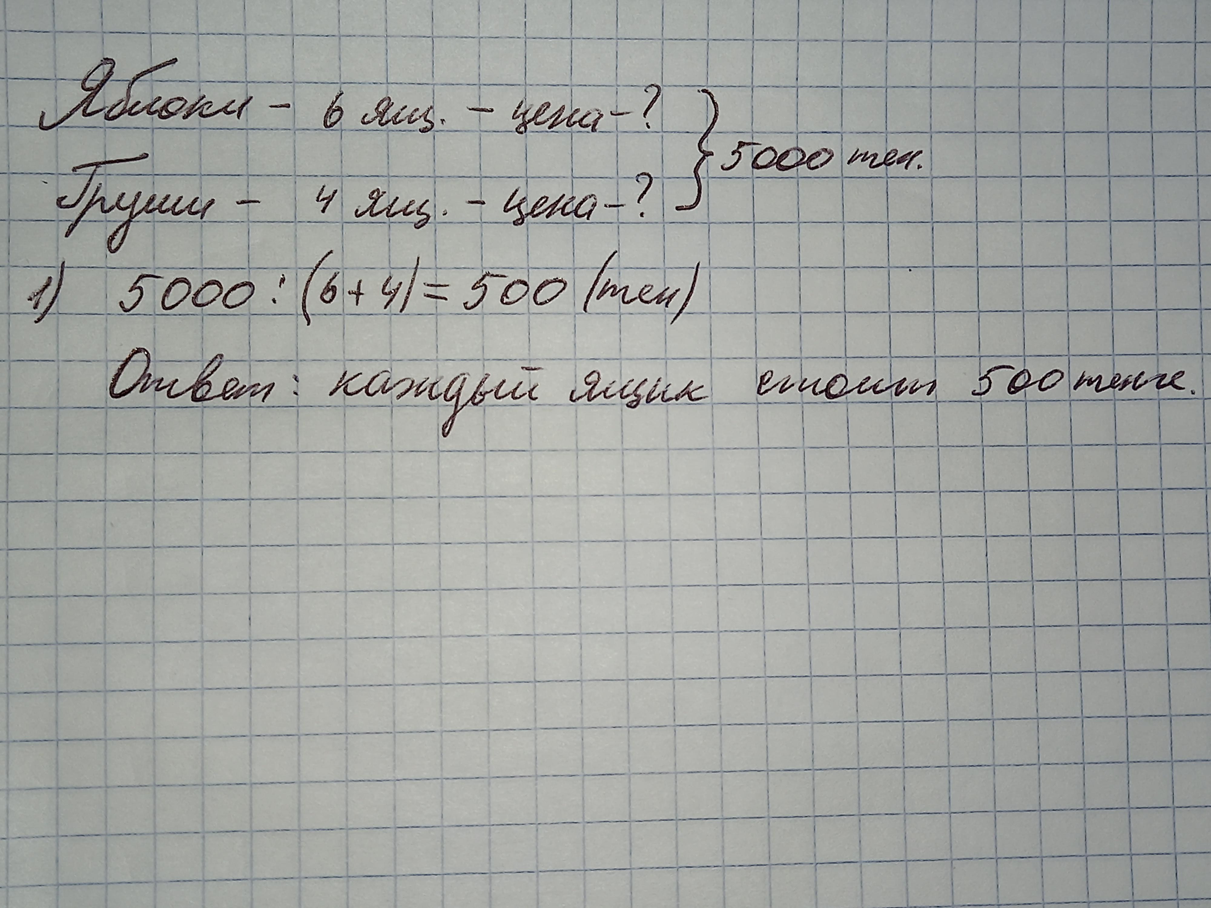 Чтобы сложить собранный урожай,дачник купил 6 новых ящиков пол яблоки и 4 таких же ящика под груши. За всю покупку он уплатил 5000 тенге(это валюта).