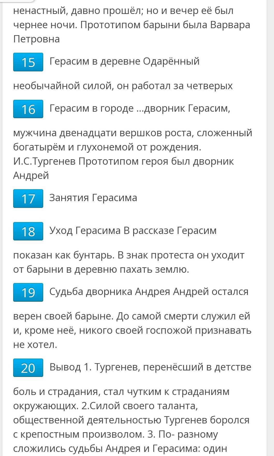 Герасим — дворник в доме барыни, глухонемой с рождения, не стар, рост 195 см., могучий, добрый, верный, трудолюбивый, строгий и серьёзный, любит порядок.