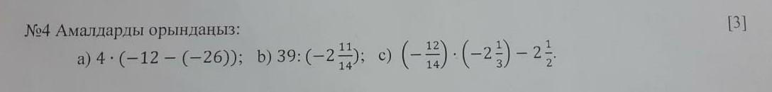 Выполните действия: а) 4 ÷ ( - 12 - ( - 26 )) б) 39 ÷ ( - 2 11/14 ) с) ( - 12/14 ) × ( - 2 1/3 ) - 2 1/2
