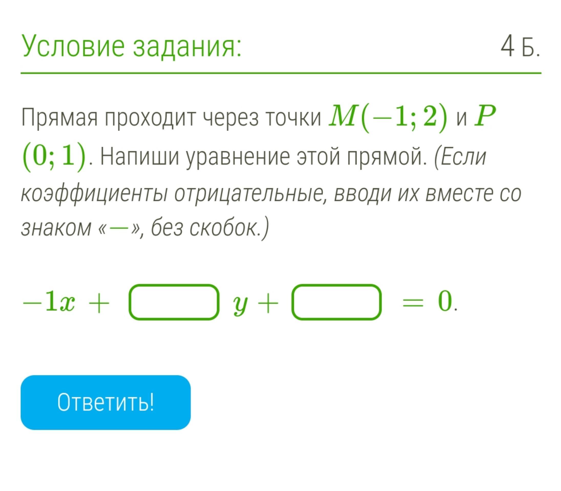 Прямая проходит через точки M(−1;2) и P(0;1). Напиши уравнение этой прямой. (Если коэффициенты отрицательные, вводи их вместе со знаком «−», без скобок.)