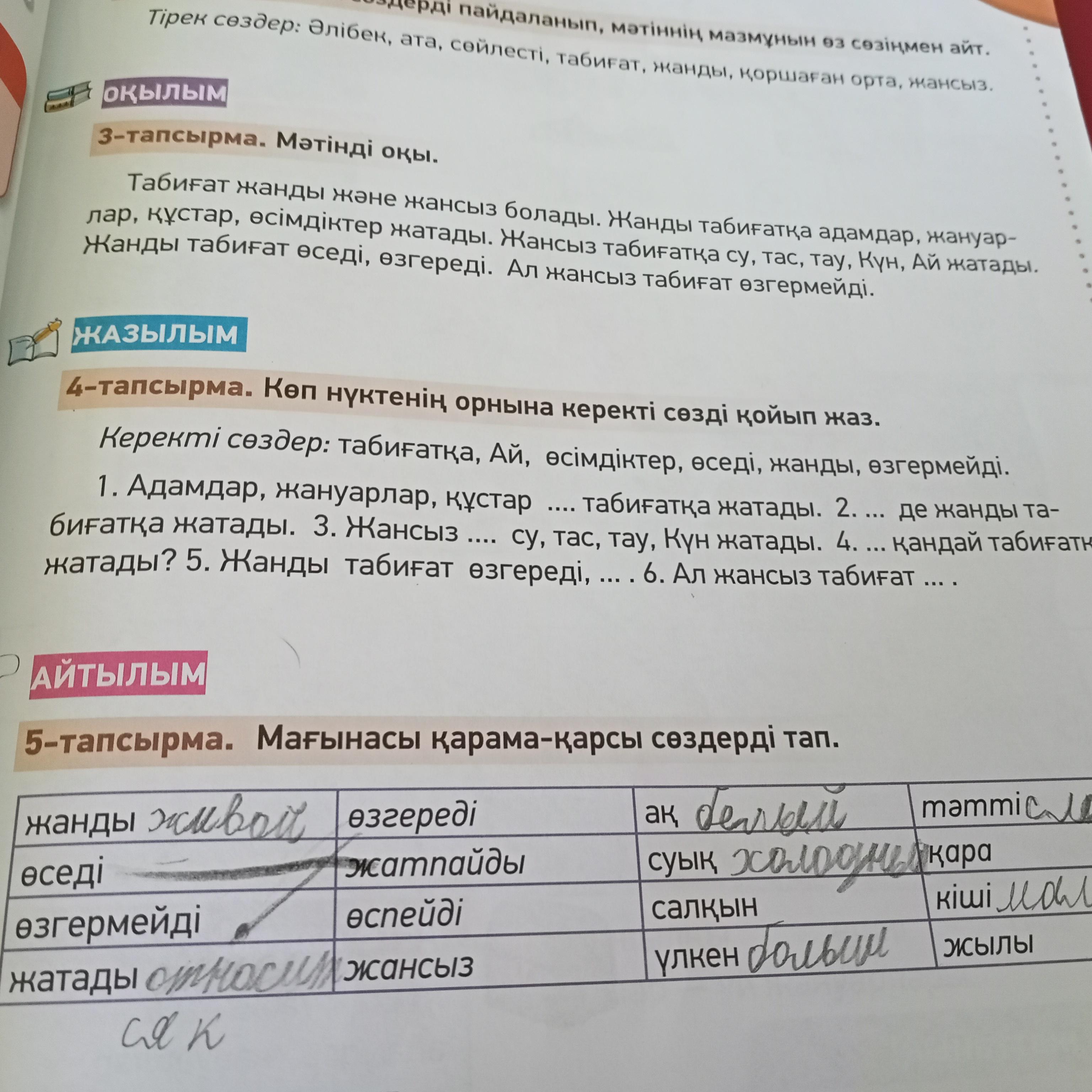 4-тап:Адамдар,жануарлар,құстар жанды табиғатқа жатады.2 Өсімдіктер де жанды табиғатқа жатады.3.Жансыз табиғатқа су,тас,тау,Күн жатады.4.Ай қандай табиғатқа жатады?5.Жанды табиғат өзгереді,өседі.