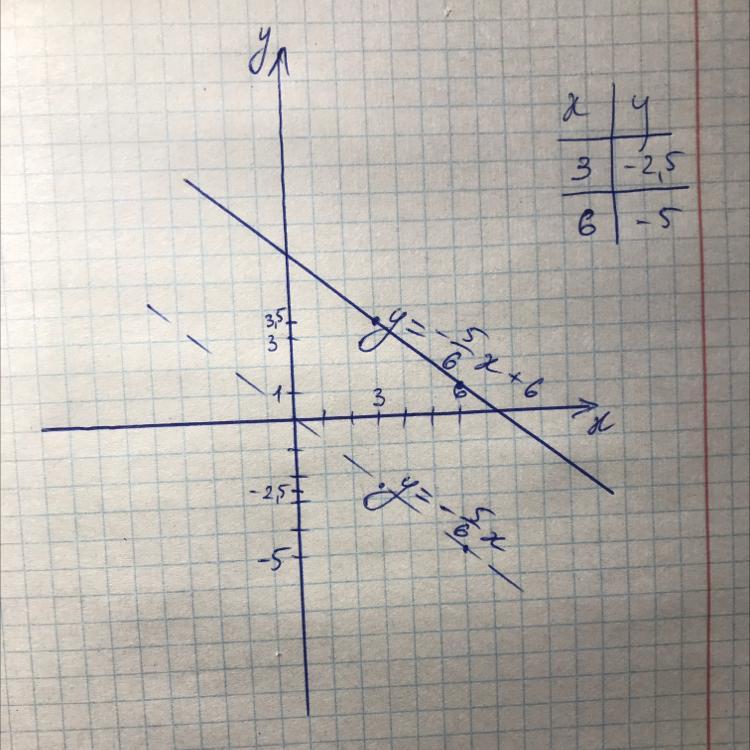 берём две точки по оси х и находим их значение по оси у через основную функцию: «у = -5/6х» в итоге получаем «изначальный график» (нарисован пунктиром, вроде как, необязателен для рисования)