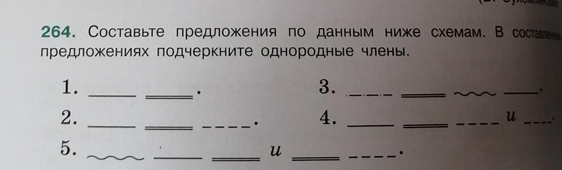 264. Составьте предложения по данным ниже схемам. В составленных предложениях подчеркните однородные члены.