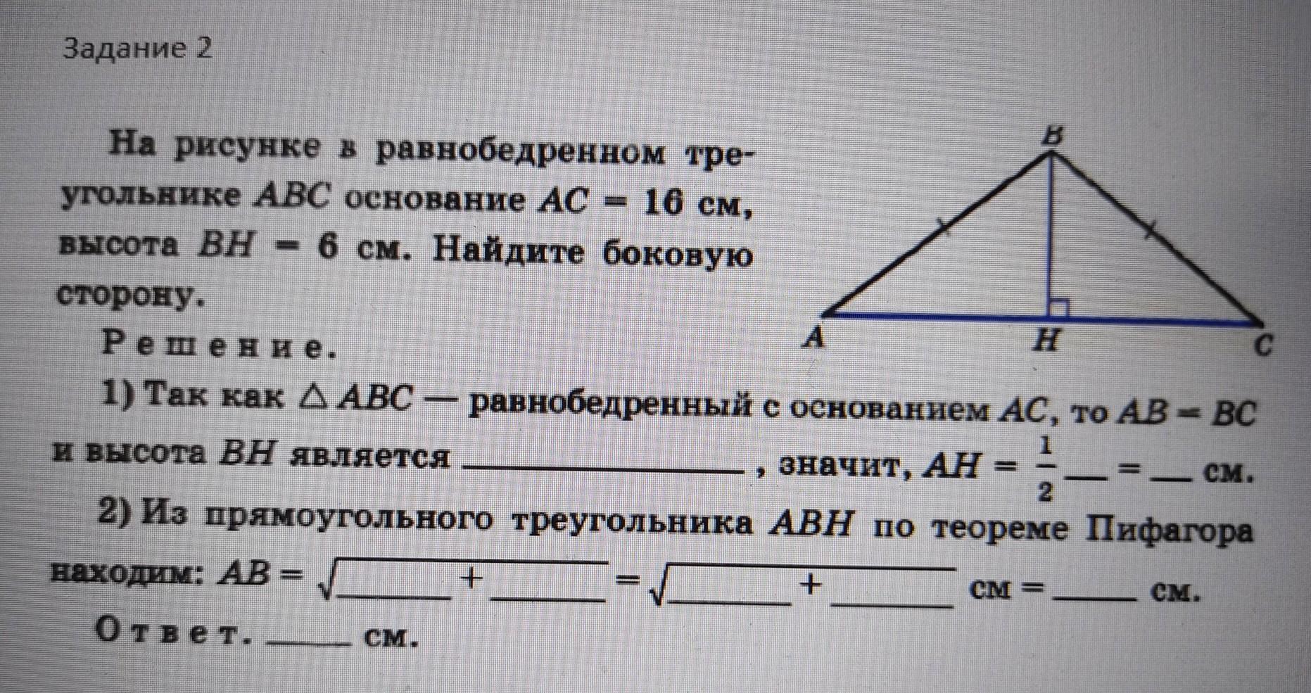 ПОЖАЛУЙСТА ПОМОГИТЕ16 см, B На рисунке в равнобедренном тре- угольнике ABC основание AC высота ВН 6 см. Найдите боковую сторону. Решение. А н с 1) Так как ДАВС - равнобедренный с основанием AC, то AB BC и высота Bн является , значит, AH = — см. 2 DE