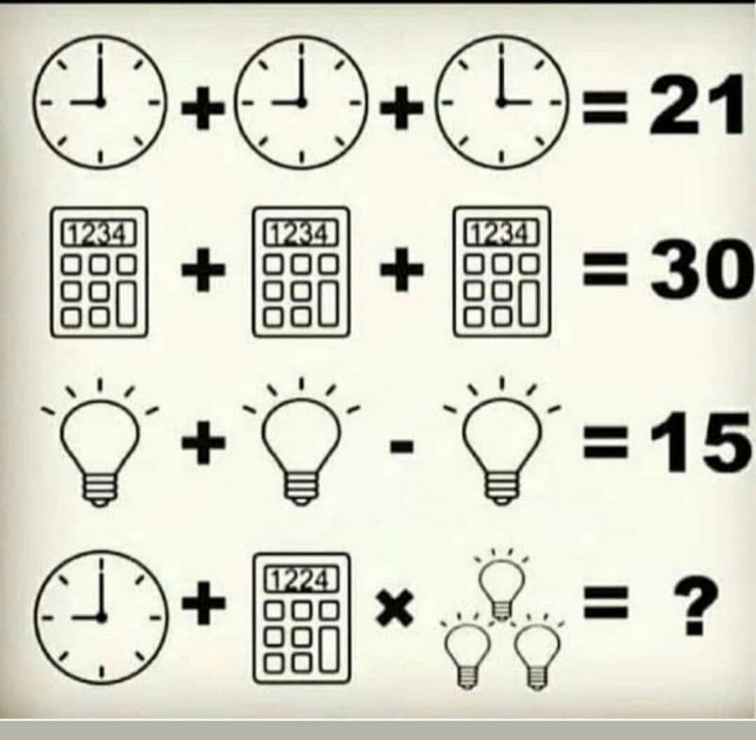 калькулятор=10=30:3, а лампочка получается=15. Тогда если часы брать по 7=21:3, то итог 7+10*15=157. Смущает , что часы в первом выражении разные:)