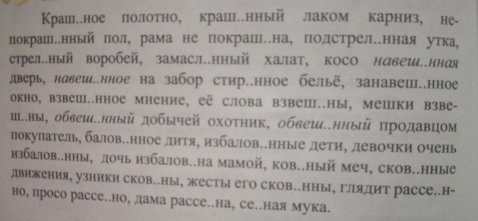 Ответ:Крашеное полотно (от глагола несовершенного вида), крашенный лаком карниз (причастный оборот, образовалось от красить + суффикс -енн-), непокрашенный пол ( образовалось от красить + суффикс -енн-), рама не покрашена (краткое причастие), подстреленная утка (образовалось от подстрелить + суффикс -енн-), стреляный воробей, замасленный халат (зависит от значения), косо навешенная ( образовалось от повесить + суффикс -енн-) дверь, навешенное ( образовалось от вешать + суффикс -енн-) на забор стиранное (суффиксы -а- и -нн-) бельё, занавешенное окно образовалось от завесить + суффикс -енн-) , взвешенное мнение образовалось от взвесить + суффикс -енн-) , её слова взвешены (краткое причастие, по примеру предыдущего), мешки взвешены (по примеру предыдущего), обвешанный добычей охотник, обвеш.анный продавцом покупатель, балованное (от баловать) дитя, избалованные дети, девочки очень избалованны, дочь избалована мамой (отыменное прилагательное), кованый (исключение) меч, скованные движения (от сковать), узники скованы (краткое причастие, по примеру предыдущего), жесты его скованны (краткое отыменное прилагательное), по примеру предыдущего), глядит рассеянно (краткое отыменное прилагательное , просо рассеяно (краткое причастие), дама рассеянна (отым.прил), сеяная мука (краткое причастие)