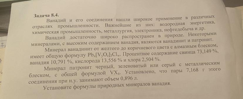 Пусть m(ванадинит) = 100 г, тогда m(Pb) = 73,149 г, m(V) = 10,791 г, m(O) = 13,556 г, m(Cl) = 2,504 г.