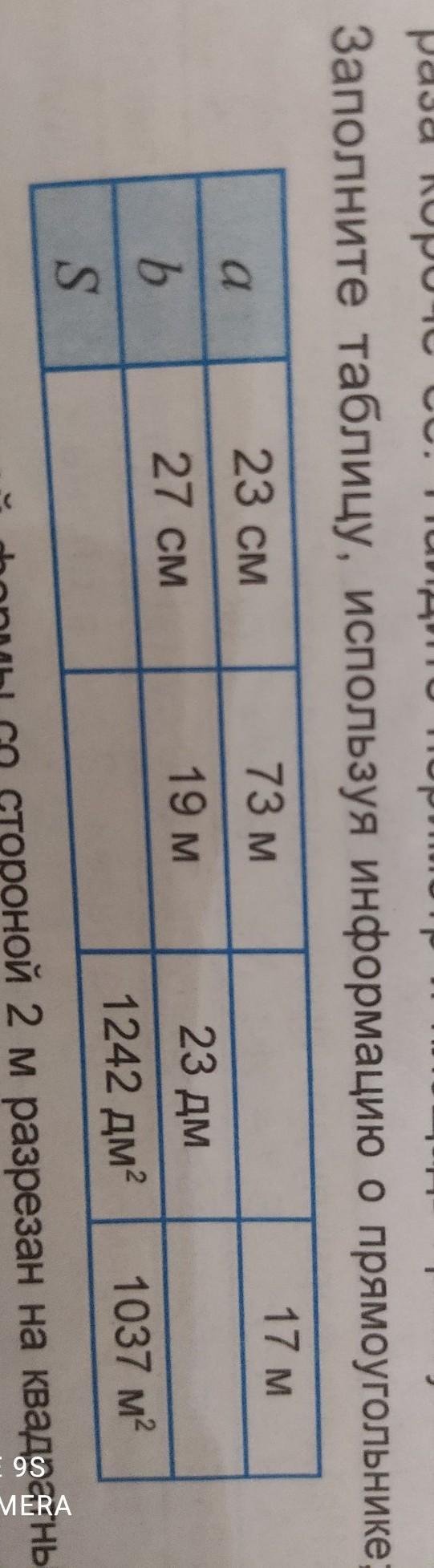 512. Заполните таблицу, используя информацию о прямоугольнике, a 23 см 73 м 17 м b 27 см 19 м 23 дм S 1242 дм? 1037 м2 1 LA ІІІe 11 помогити срочно!!!!
