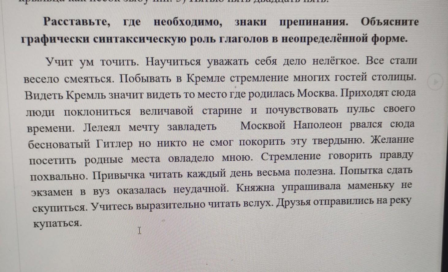 Учить__ - ум точить==. Научиться__ уважать__ (часть сложн.подлеж.)себя__ - дело нелёгкое. Все стали== весело смеяться==(часть СГС). Побывать__ (часть слож.подлеж.) в Кремле__ - стремление многих гостей столицы. Видеть__ Кремль__ - значит видеть== (часть СИС) то место==, где родилась Москва. Приходят сюда люди поклониться--- (дополнение) величавой старине и почувствовать пульс своего времени. Лелеял мечту завладеть--- (дополнение) Москвой Наполеон, рвался сюда бесноватый Гитлер, но никто не== смог== покорить== (часть СГС) эту твердыню. Желание× посетить~~~ (несоглас.оределен.) родные места овладело мною. Стремление× говорить~~~ (несоглас.определ.) правду похвально. Привычка× читать~~~(несоглас.определ.) каждый день весьма полезна. Попытка× сдать~~~ (несоглас.определ.) экзамен в вуз оказалась неудачной. Княжна упрашивала маменьку не скупиться--- (дополнен.). Учитесь== (ПГС) выразительно читать вслух. Друзья отправились== (ПГС) на реку купаться.
