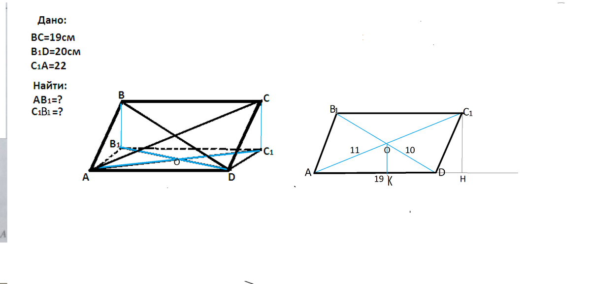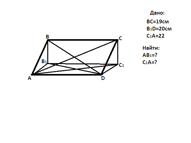 Проекции диагоналей на плокость равны диагоналям параллелограмма АВ1С1D со сторонами АД=В1С1=19.
