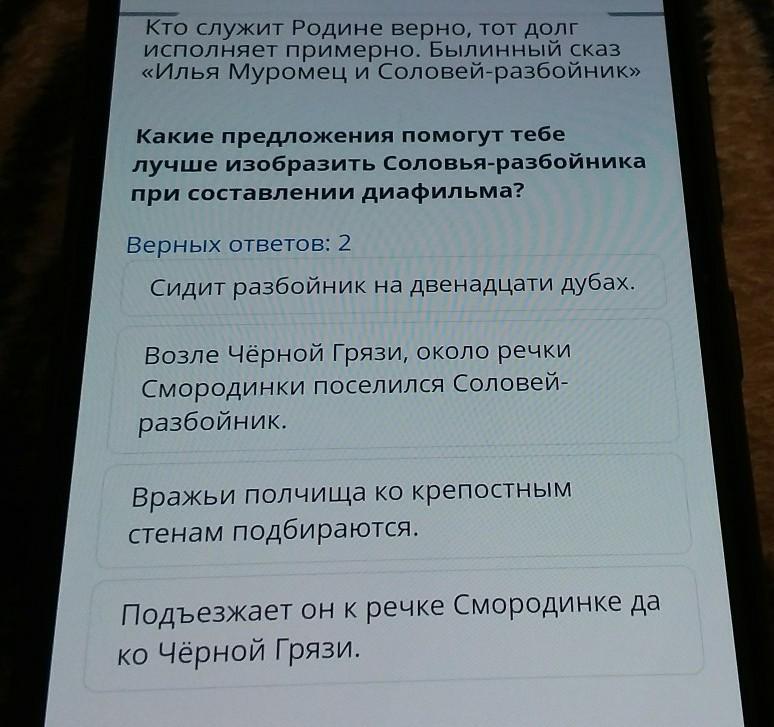 Какие предложения помогут тебе лучше изобразить Соловья-разбойника при составлении диафильма? Верных ответов: 2 Сидит разбойник на двенадцати дубах. Возле Черной Грязи, около речки Смородинки поселился Соловей- разбойник. Вражьи полчища ко крепостным стенам подбираются. Подъезжает он к речке Смородинке да ко черной Грязи.