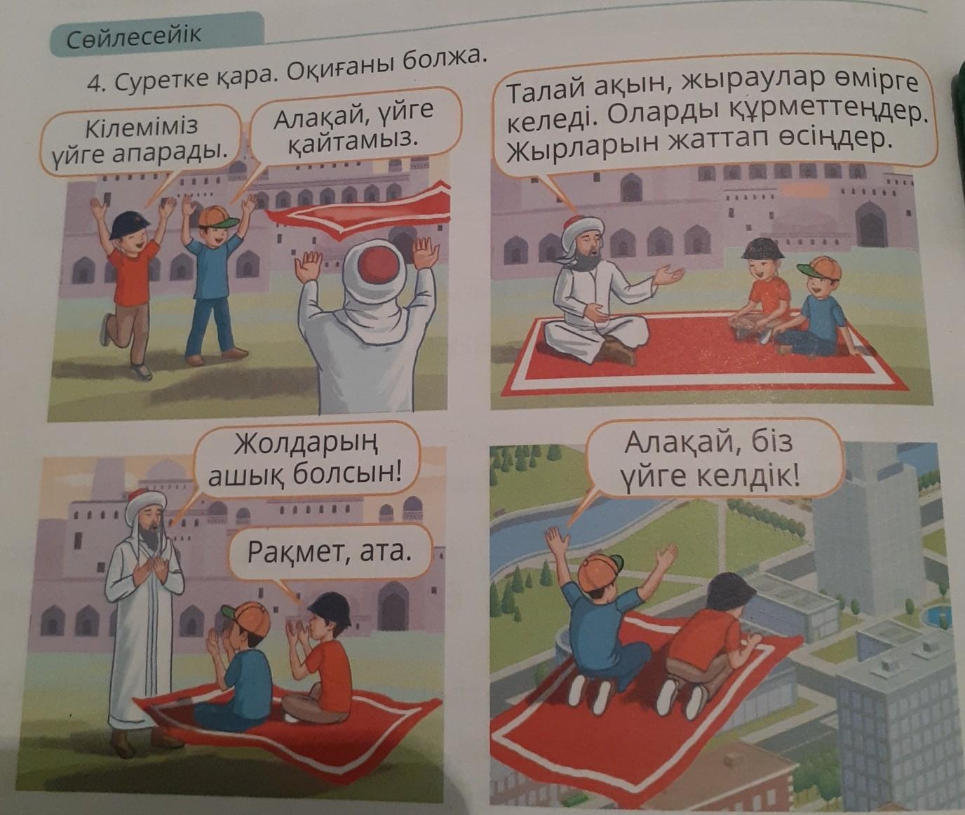 4. Суретке қара. Оқиғаны болжа. Талай ақын, жыраулар өмірге Кілеміміз Алақай, үйге келеді. Оларды құрметтеңдер. үйге апарады. қайтамыз. Жырларын жаттап өсіңдер. 1. Жолдарың ашық болсын! ! Алақай, біз үйге келдік! Рақмет, ата.
