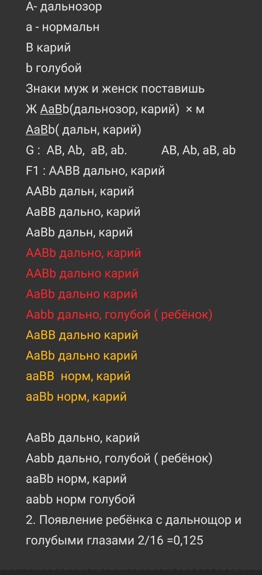 У человека некоторые формы дальнозоркости доминируют над нормальным зрением, карий цвет глаз — над голубым. Определи вероятность появления в потомстве дальнозорких детей с голубыми глазами, если оба родителя гетерозиготны по обоим признакам. НЕ ОКРУГЛЯЙТЕ ОТВЕТ.
