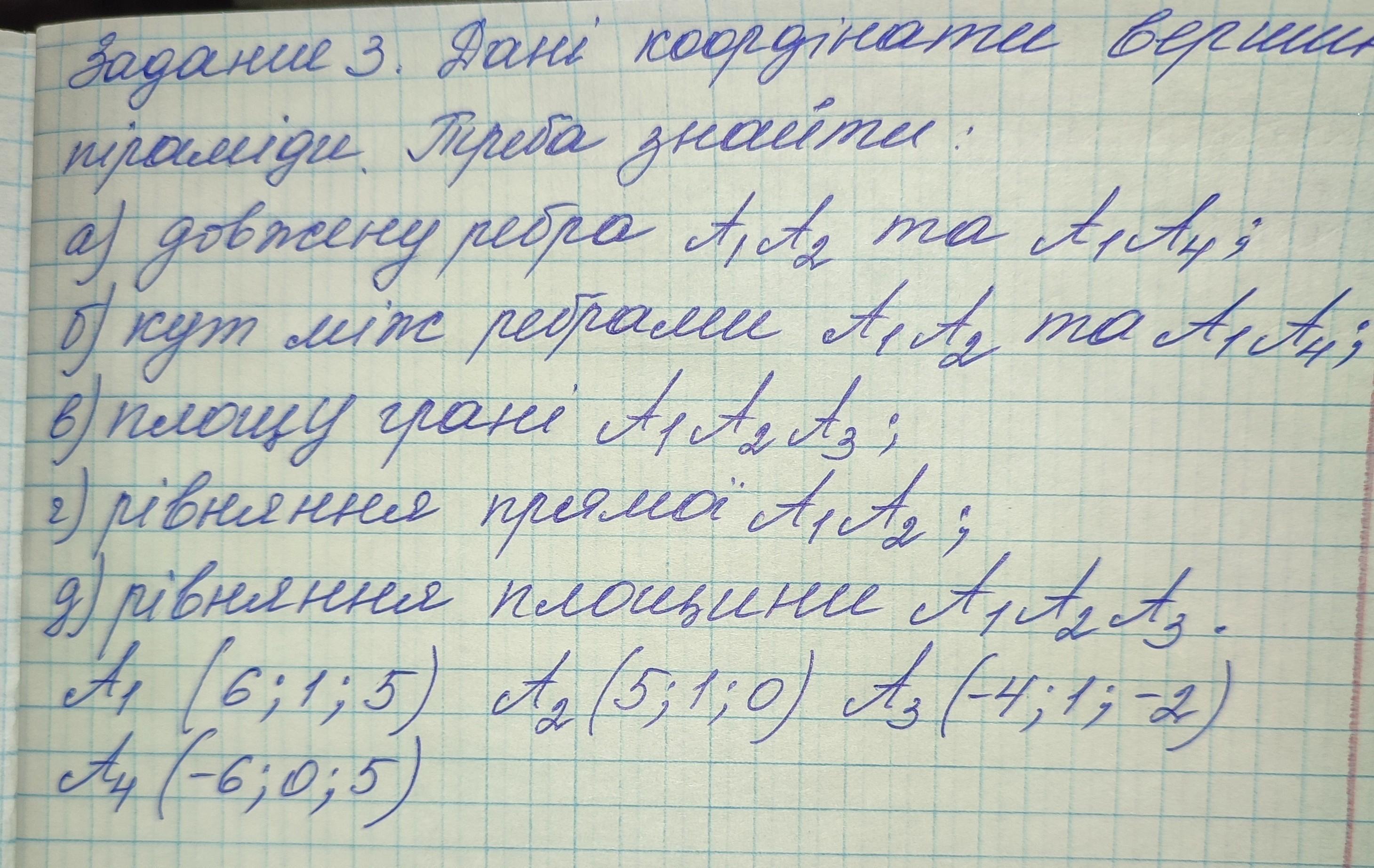 A1(6; 1; 5), A2 (5; 1; 0), A3(-4; 1; -2), A4(-6; 0; 5).