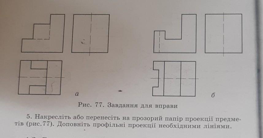 Накресліть або перенесіть на прозорий папір проекції предметів (рис.77). Доповніть профільні проекції необхідними лініями. ПОМОГИТЕ ПОЖАЛУЙСТА СРОЧНО
