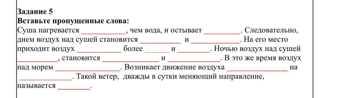 Суша нагревается быстрее, чем вода, и остывает медленнее. Следовательно, днем воздух над сушей становится теплее и легче. На его место приходит воздух с моря более холодный и тяжелый. Ночью воздух над сушей остывает, становится холоднее и тяжелее. В это же время воздух над морем более теплый поднимается. Возникает движение воздуха с суши на море. Такой ветер, дважды в сутки меняющий направление, называется бриз.