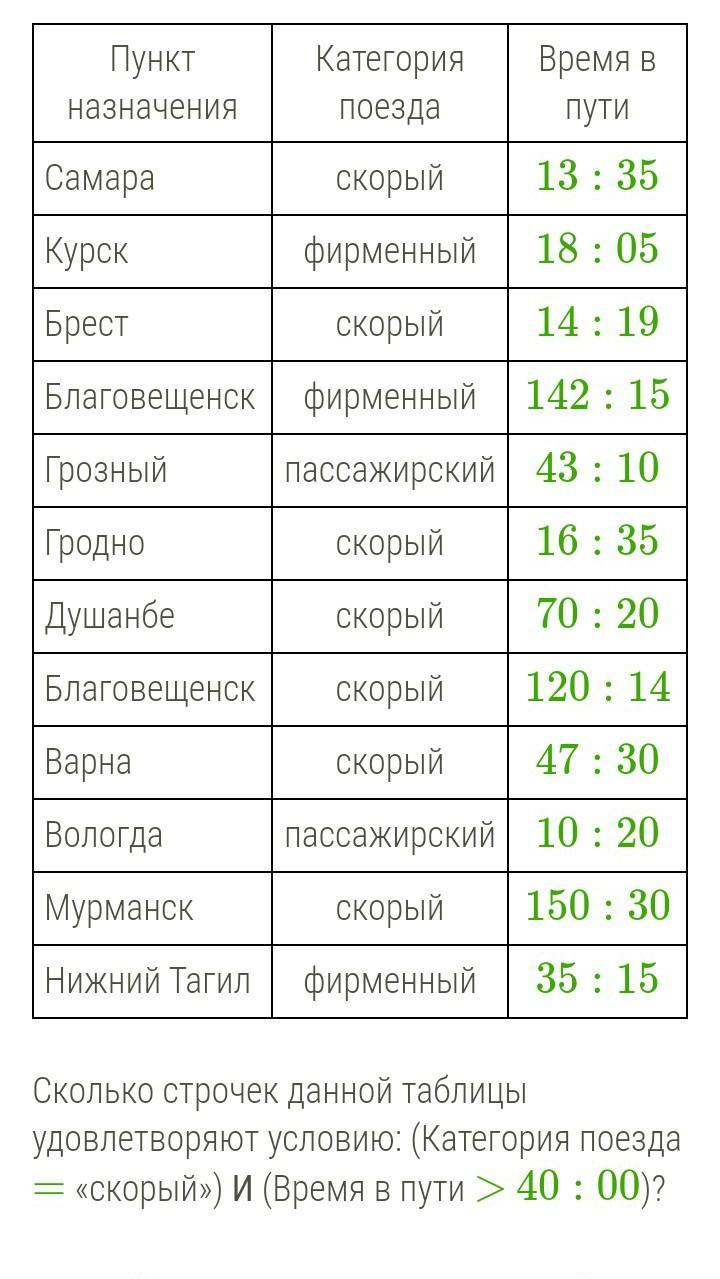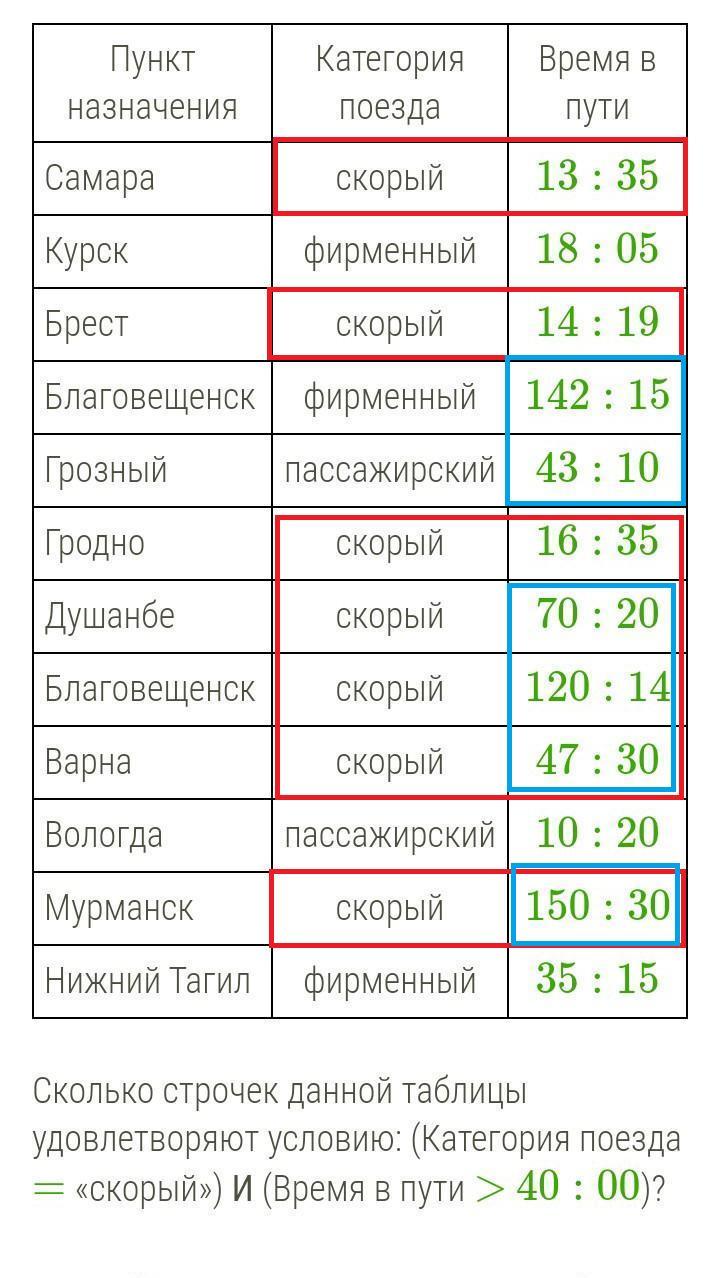 Отметим красным все скорые поезда, а синим -- те, что в пути более 40 минут. Там где синий и красный пересекутся -- будут нужные поезда, так как стоит И, а значит должны выполняться оба условия.