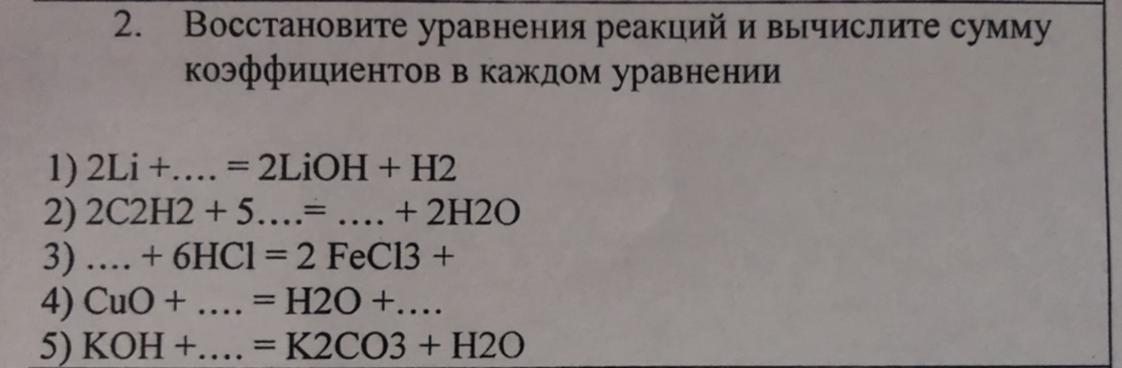 2. Восстановите уравнения реакций и вычислите сумму коэффициентов в каждом уравнении:
