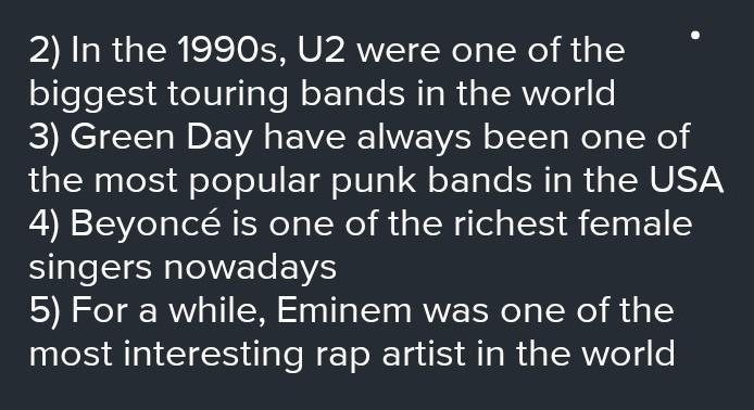5 Complete the sentences with one of and the correct form of the adjectives in brackets 1 Nirvana were one of the most succes! successful bands to come out of Seattle 2 In the 1990s, U2 were (bio touring bands in the world. 3 Green Day have always been (popular) punk bands in the USA 4 Beyonce is (nch) female singers nowadays 5 for a while. Eminem was (interesting rap artists in the world